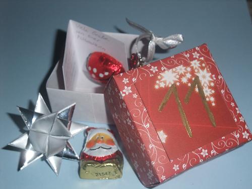 Das 11. Päckchen kam schon rein äußerlich herrlich weihnachtlich daher. Innen fand ich einen Fröbelstern, filigrane Perlenhängerchen und Schokolade. 😀